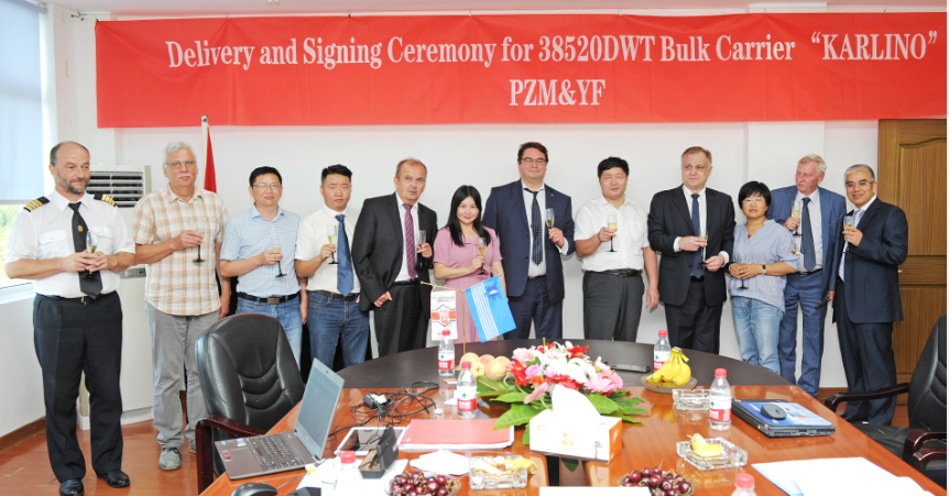 2019年7月30日下午,揚(yáng)帆集團(tuán)下屬浙江東海岸船業(yè)有限公司建造的一艘38520噸系列散貨船正式簽字交船。