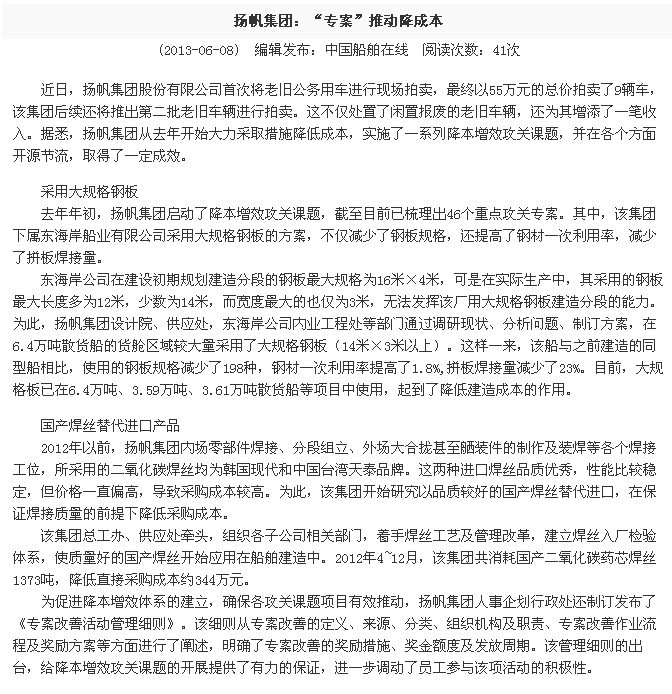 中國船舶在線:揚帆集團:“專案”推動降成本